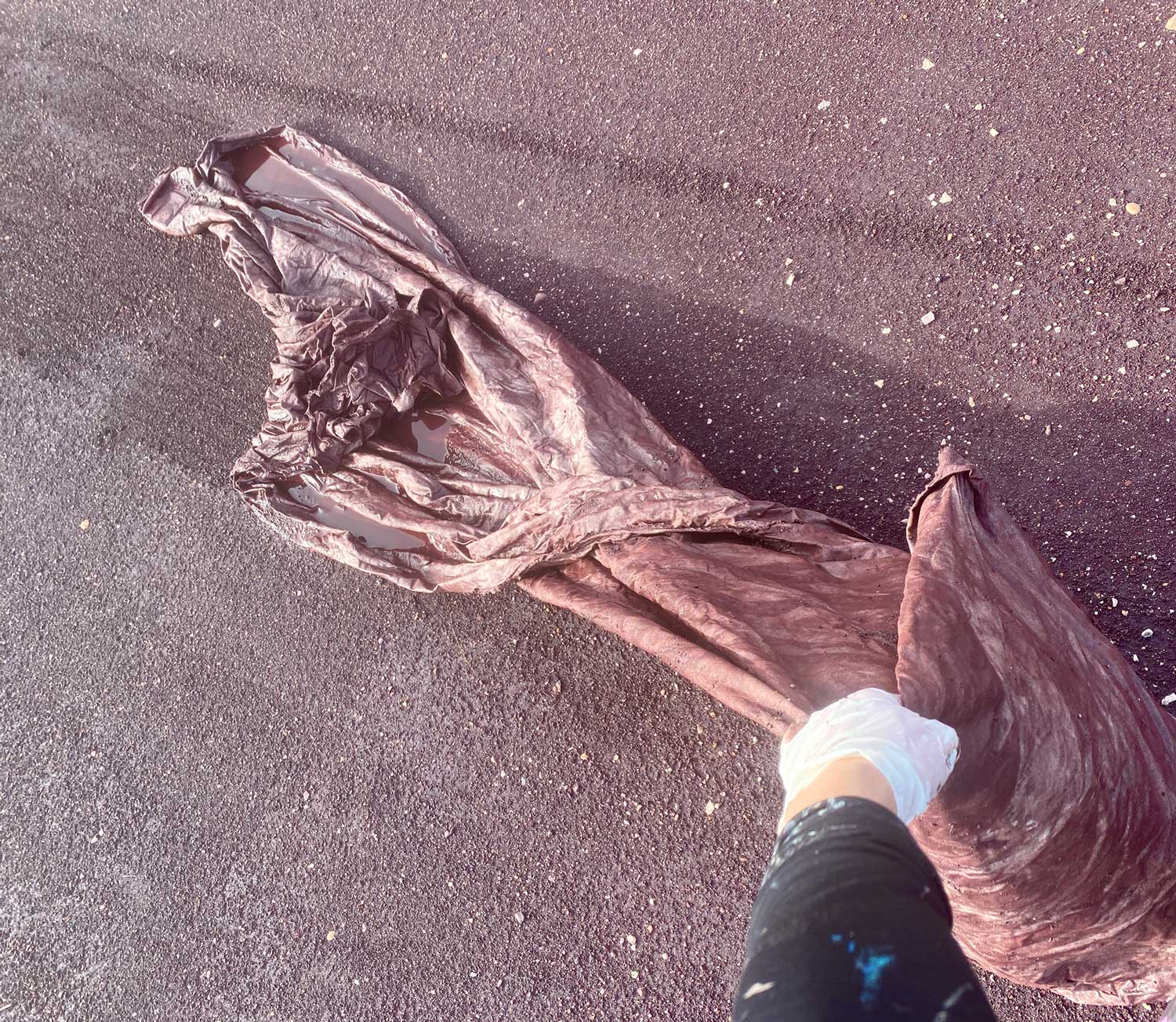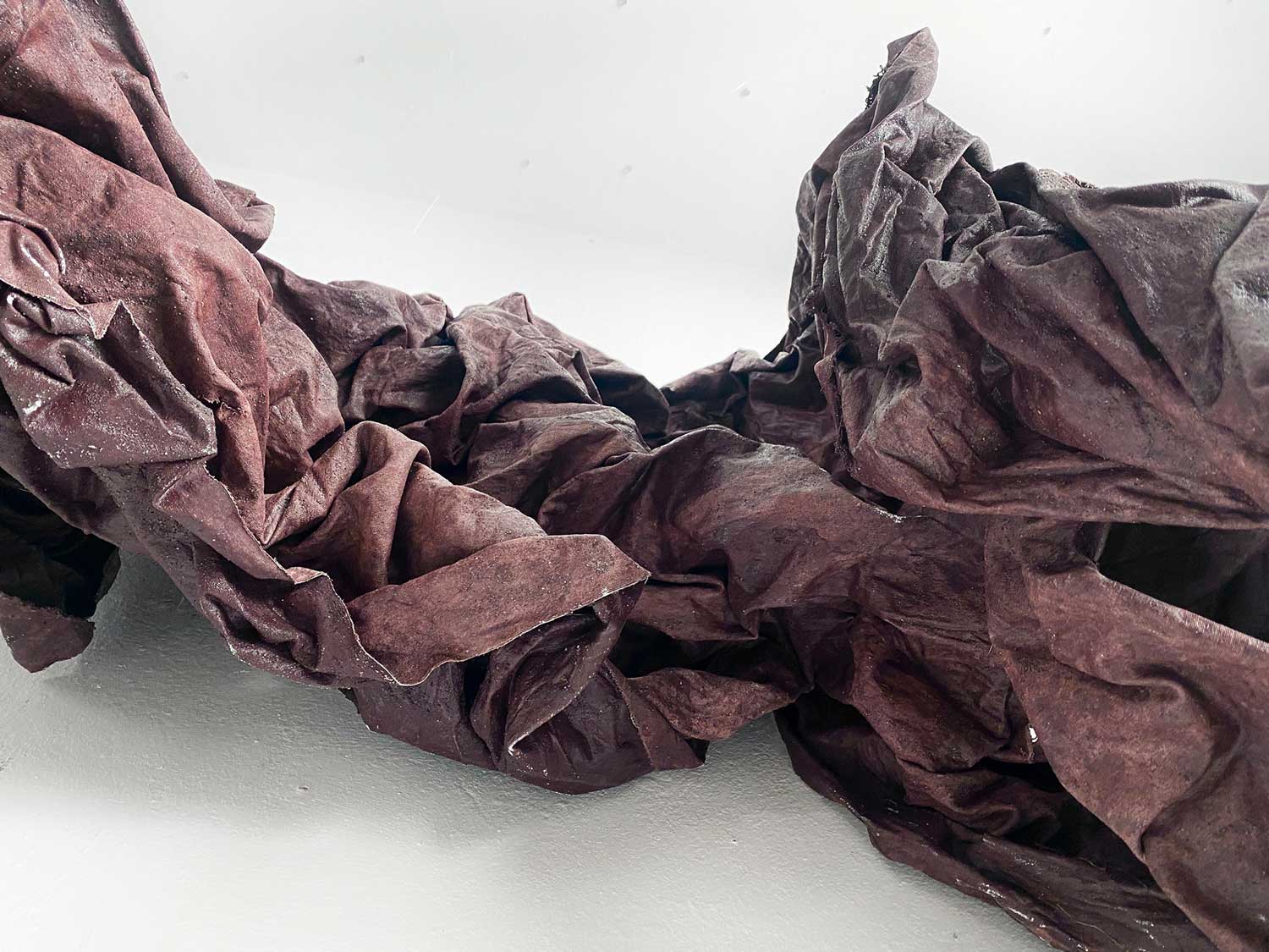 The forms meander through the space above us as a dark purple, floating mass. Labyrinths with a bloody, earthy, fat, dark surface, with organic, bulging forms seem to have solidified, telling of upheaval states, resistance, limbo, pain. They are the result of experiments in the pigment-soaked post-industrial area of Caput Mortuum, where nature and industry merge, where productivity is still palpable and now stands still. They immerse themselves in the ruins of this landscape, amidst the human and industrial remains of a memorable past.