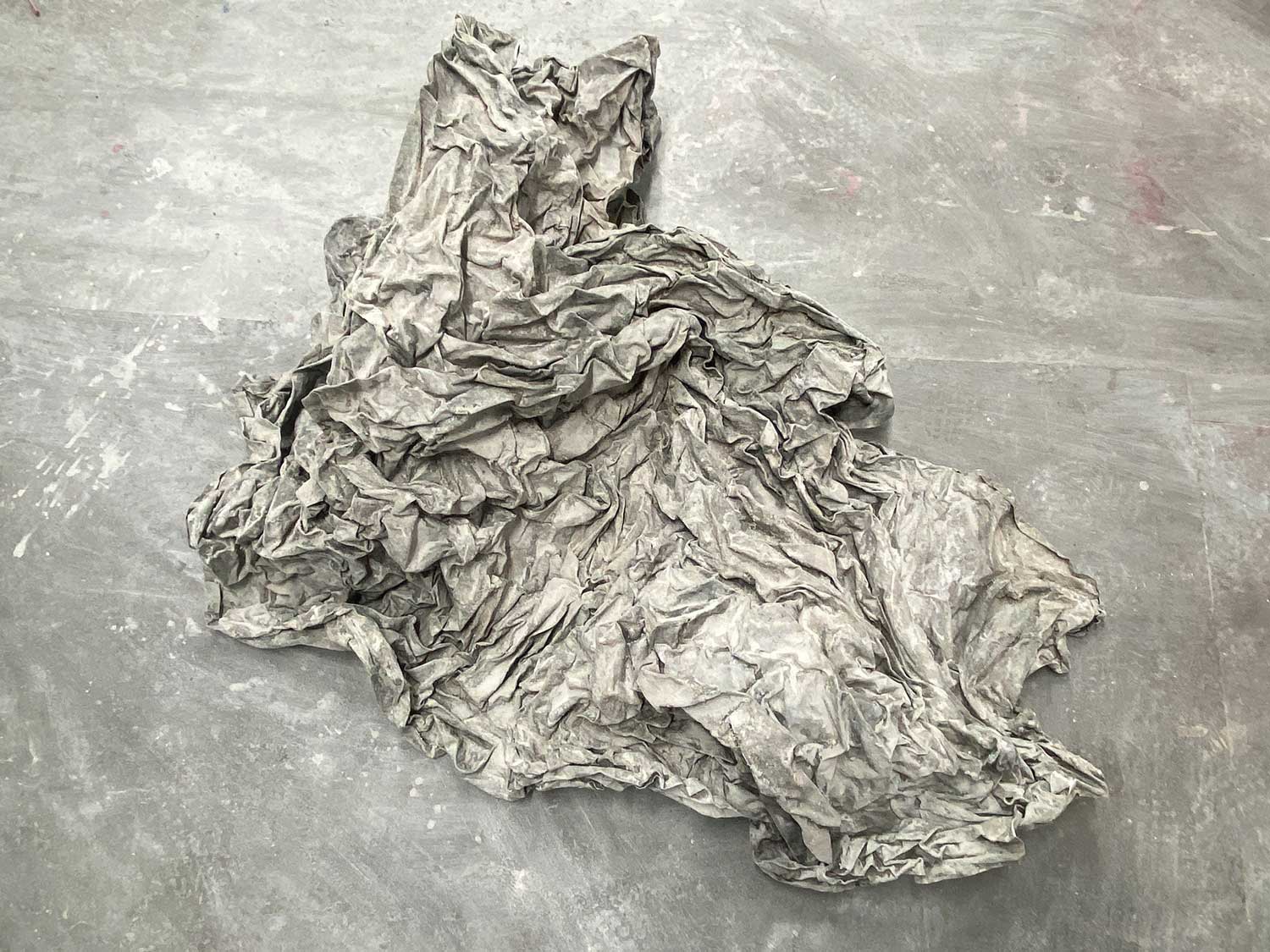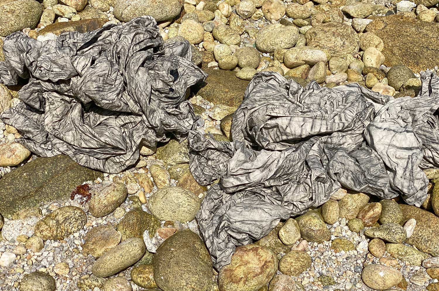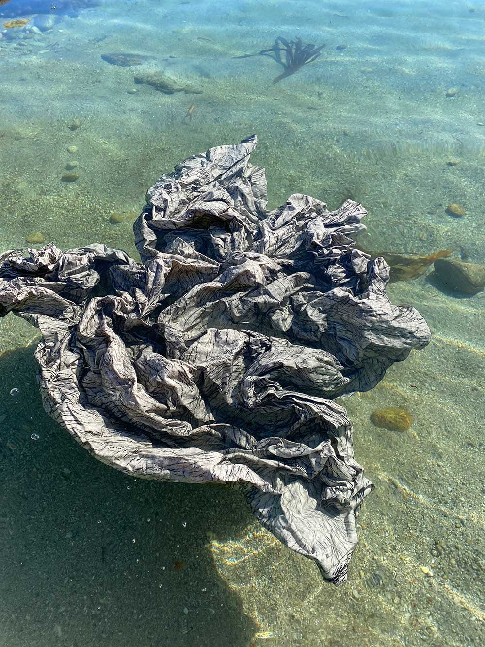 Her process reveals itself through the rituals of bathing herself and the fabric, exploring the movement of water and the aesthetics of transformation. *She documents the movement of fabric through light and reflection in the water — creating sculptures in motion*. The amorphous forms that emerge seem like evidence from a time long gone — like creatures of the sea, with deep furrows and branches resembling labyrinths.