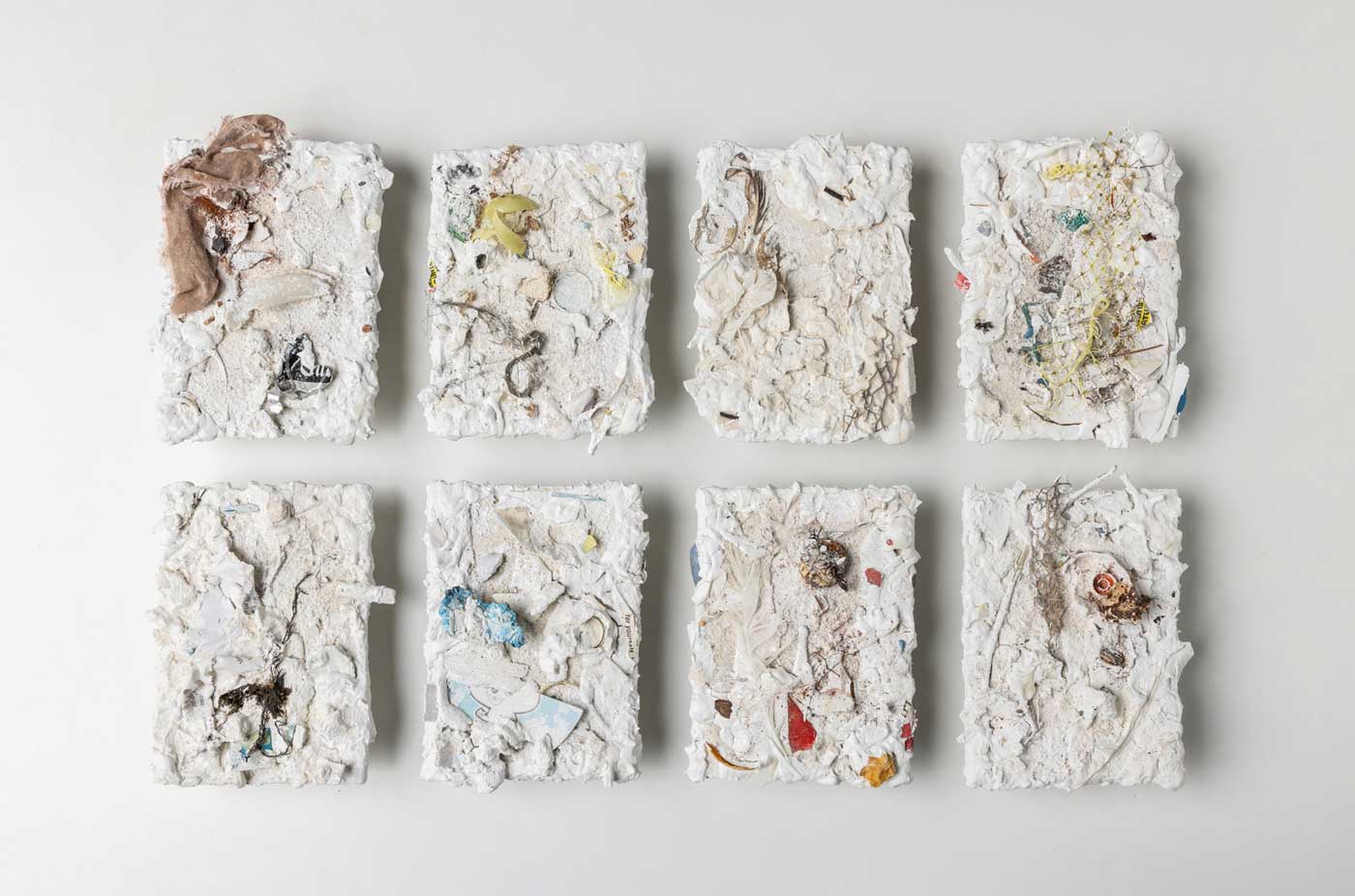 Gesso, dried plants, sepia shell, mussel pieces, plastic rubbish from the galician Costa da morte on panel