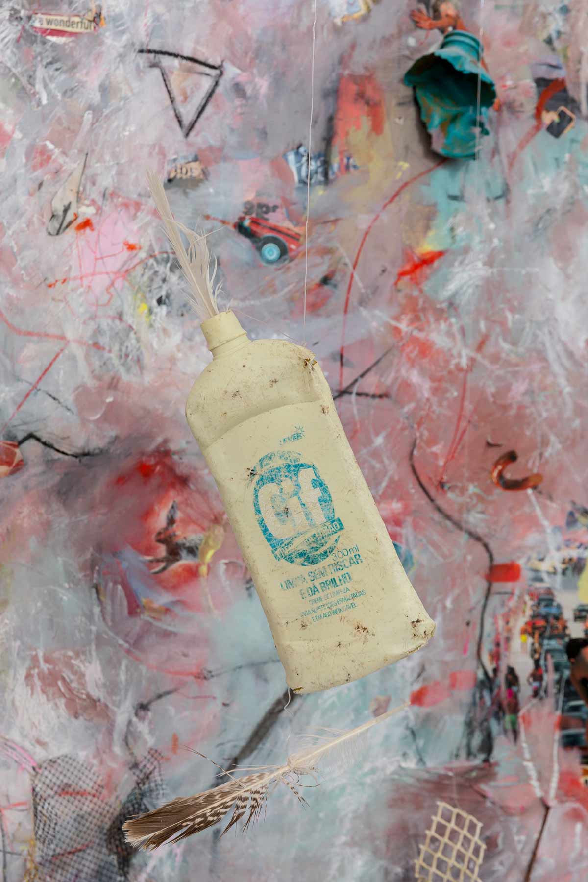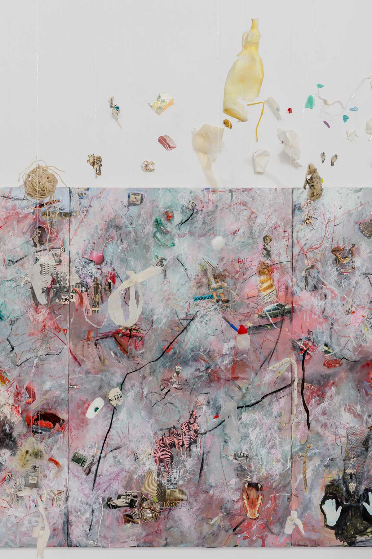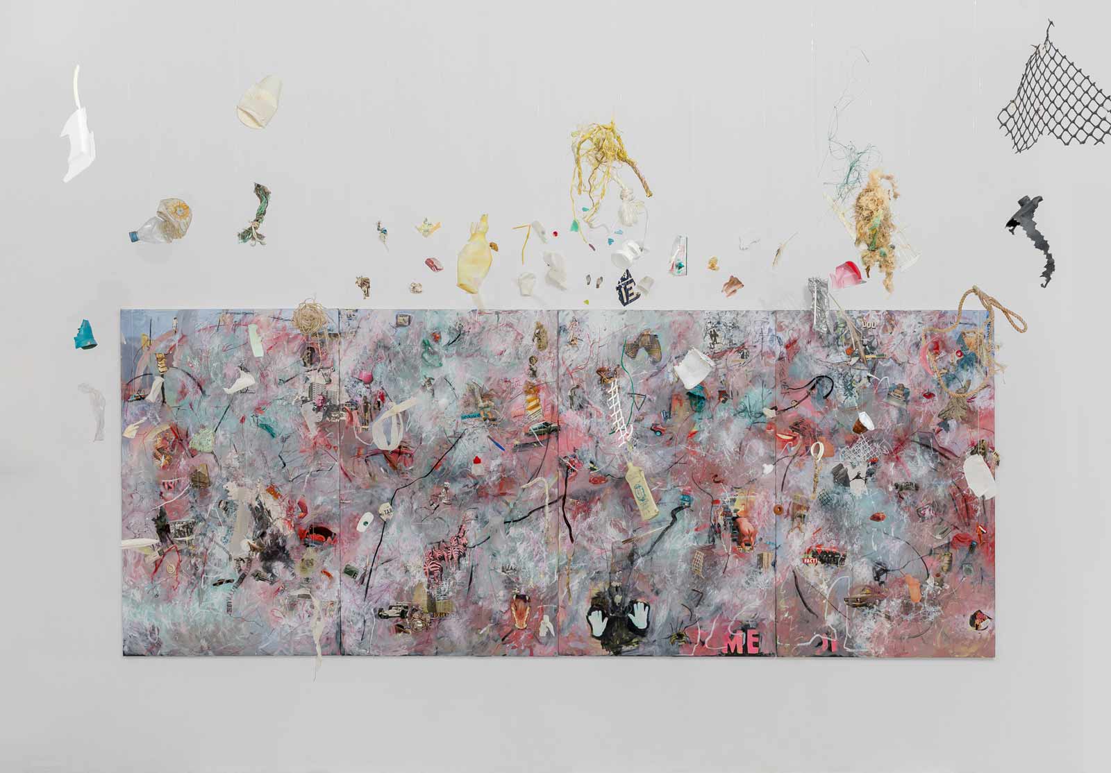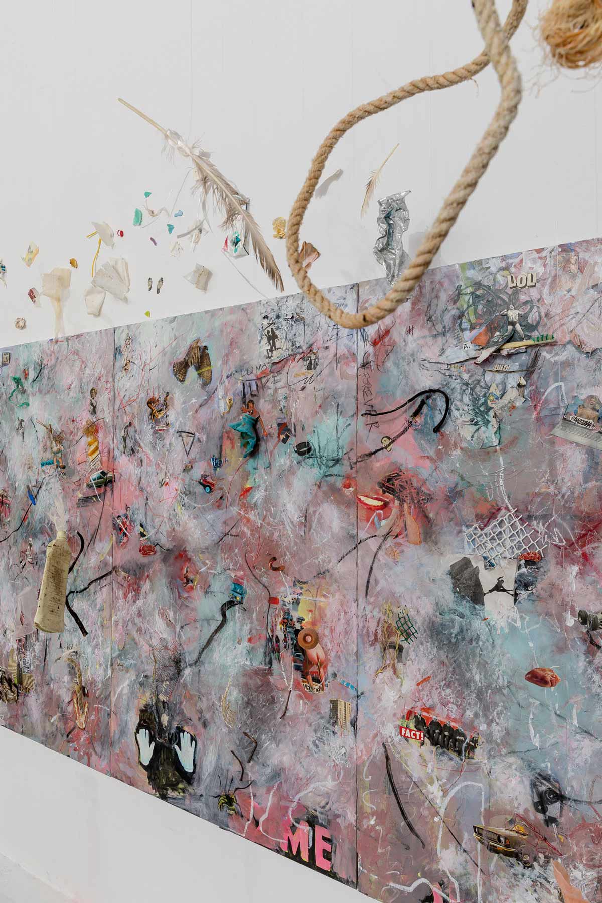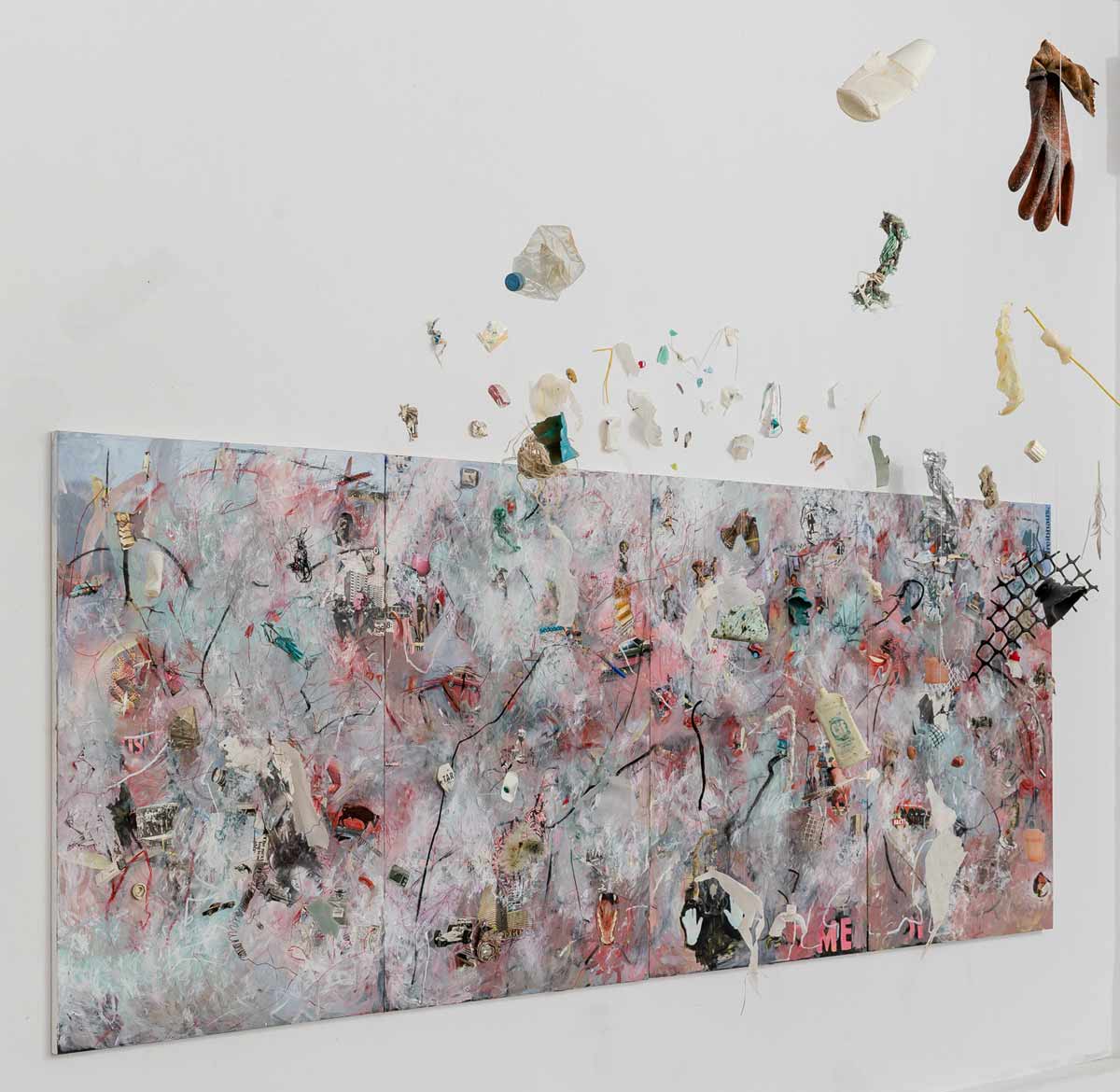 „The Big Reflection“ illustrates the confusion of society, permanently interconnected, seeking entertainment and surviving in the whirlwind of information and production overload. The objects that emerge from the painting are part of this as a memento of the consequences of our hyper-consumerist actions. (Painting, Installation)