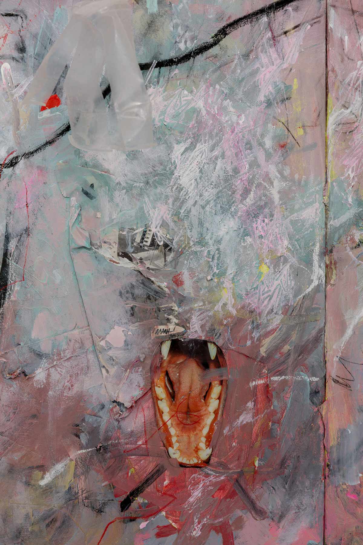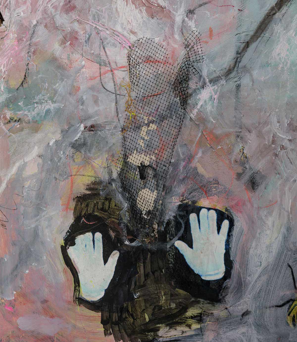 Acrylic, oil pastel, charcoal, paper, collage on canvas;